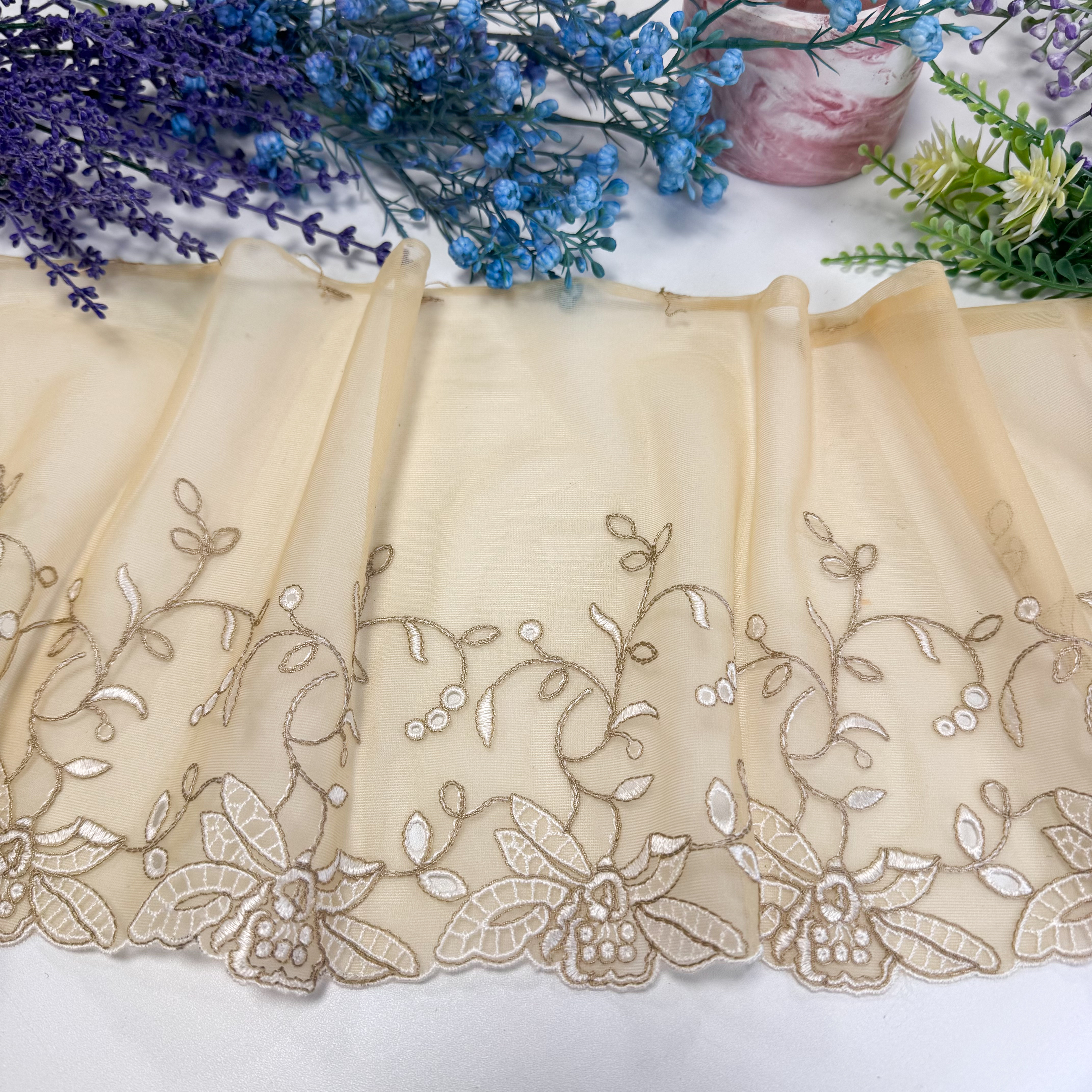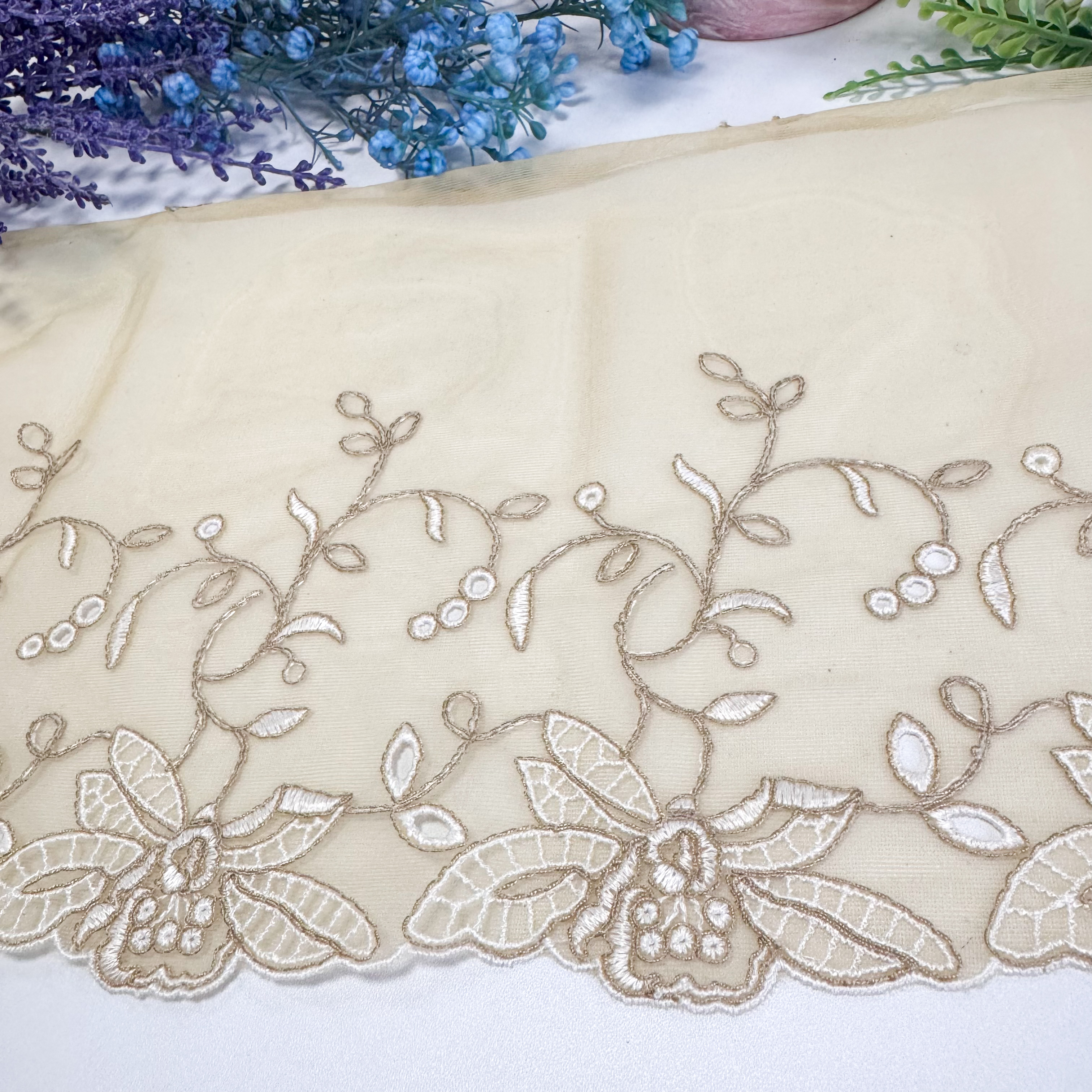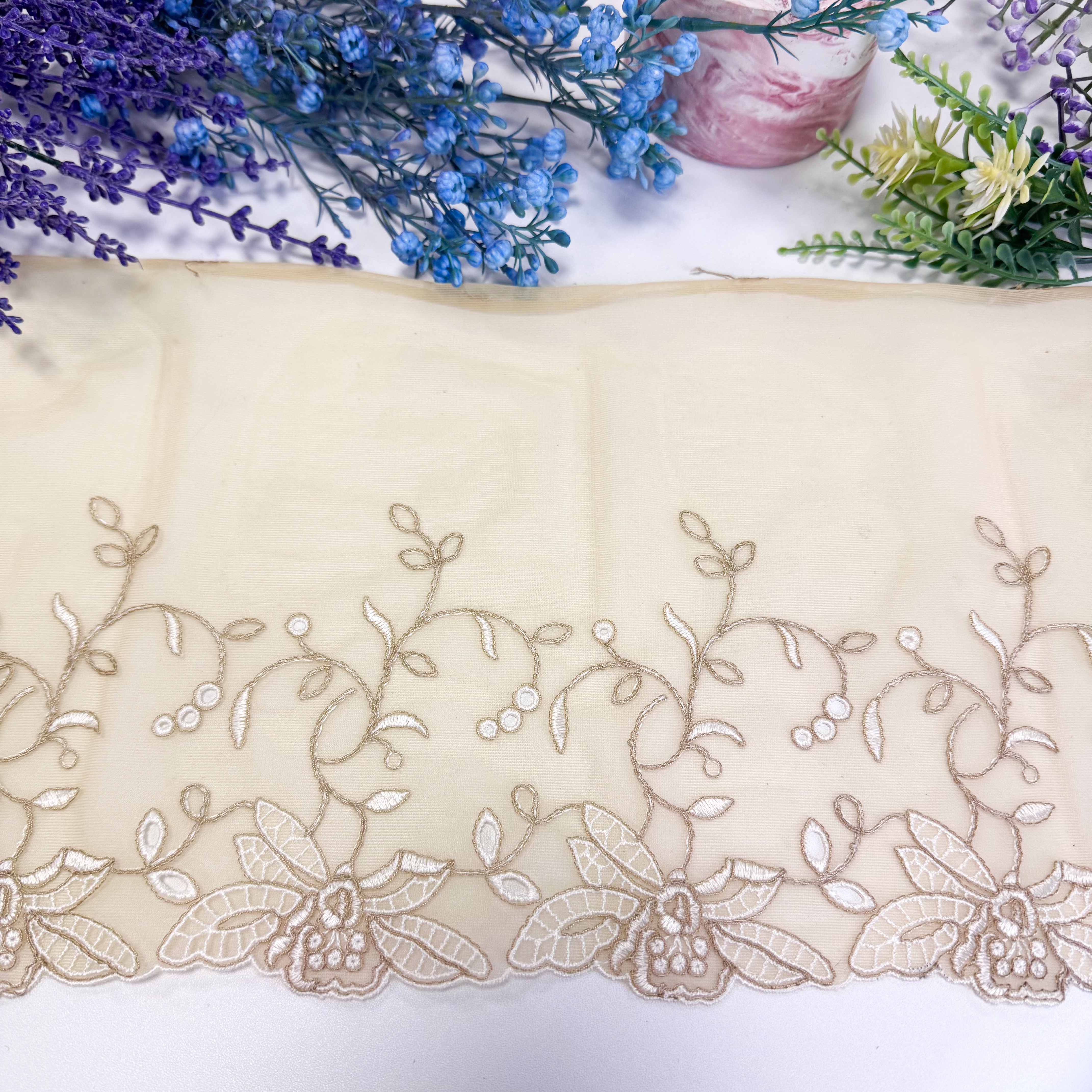 Кружево не стрейч вышивка на сетке, бежевое, шир. 20 см, арт. 1941К