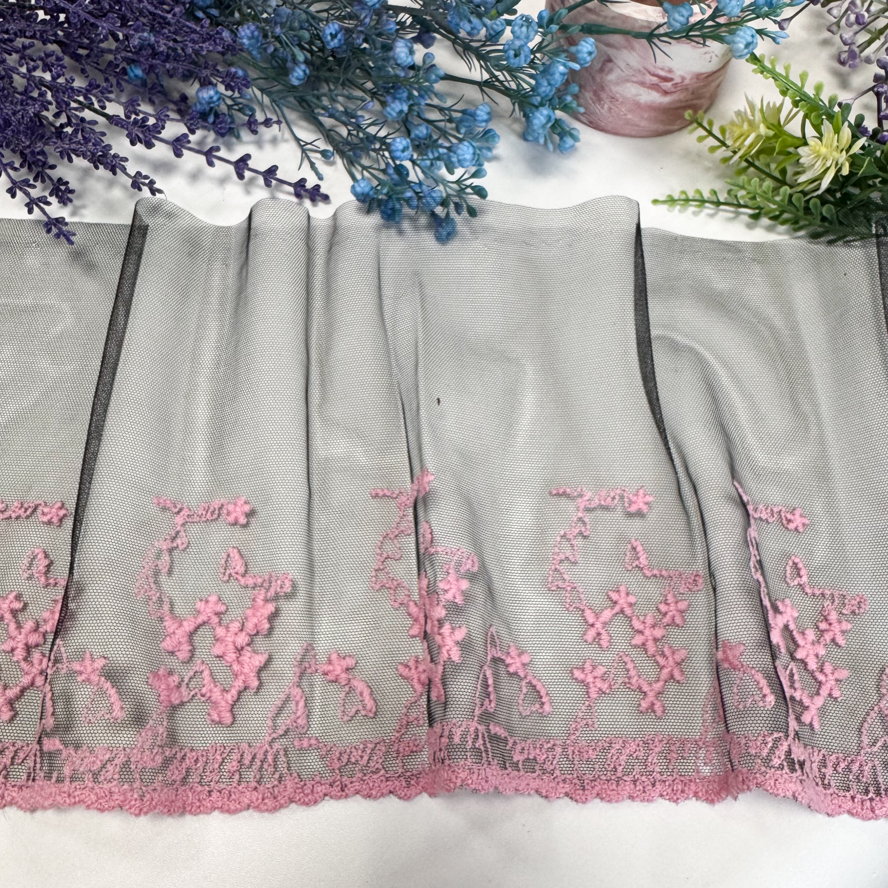 Кружево не стрейч вышивка на сетке, черное с розовым, шир. 21 см, арт. 1950К