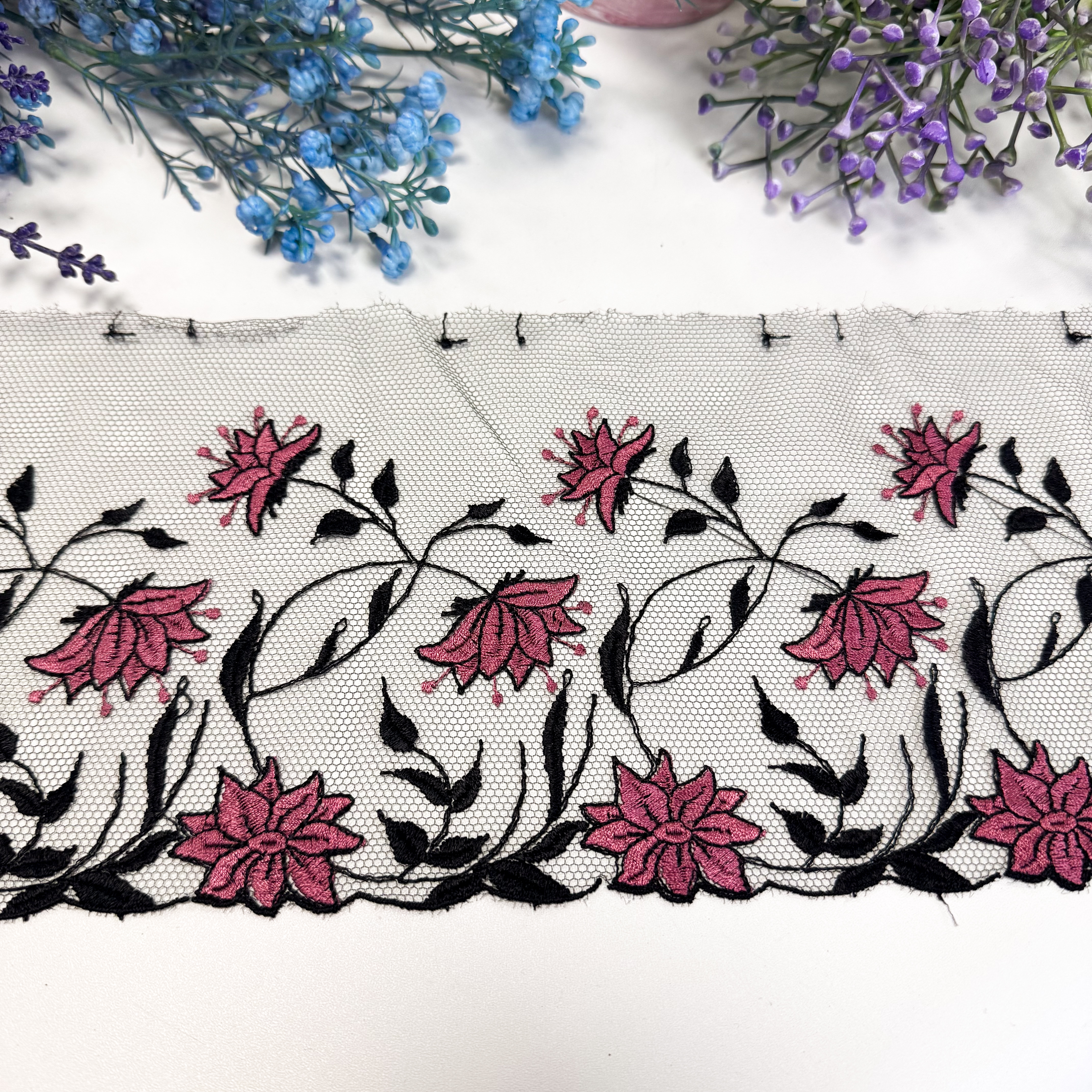 Кружево не стрейч вышивка на сетке, черное, шир. 15 см, арт. 1939К