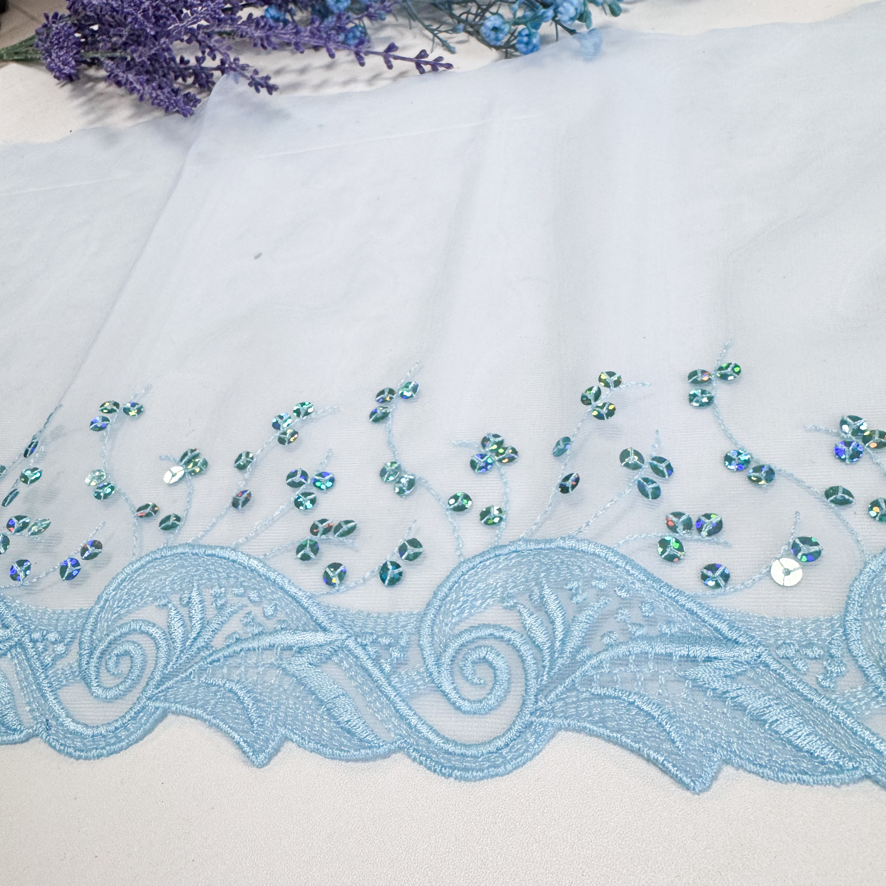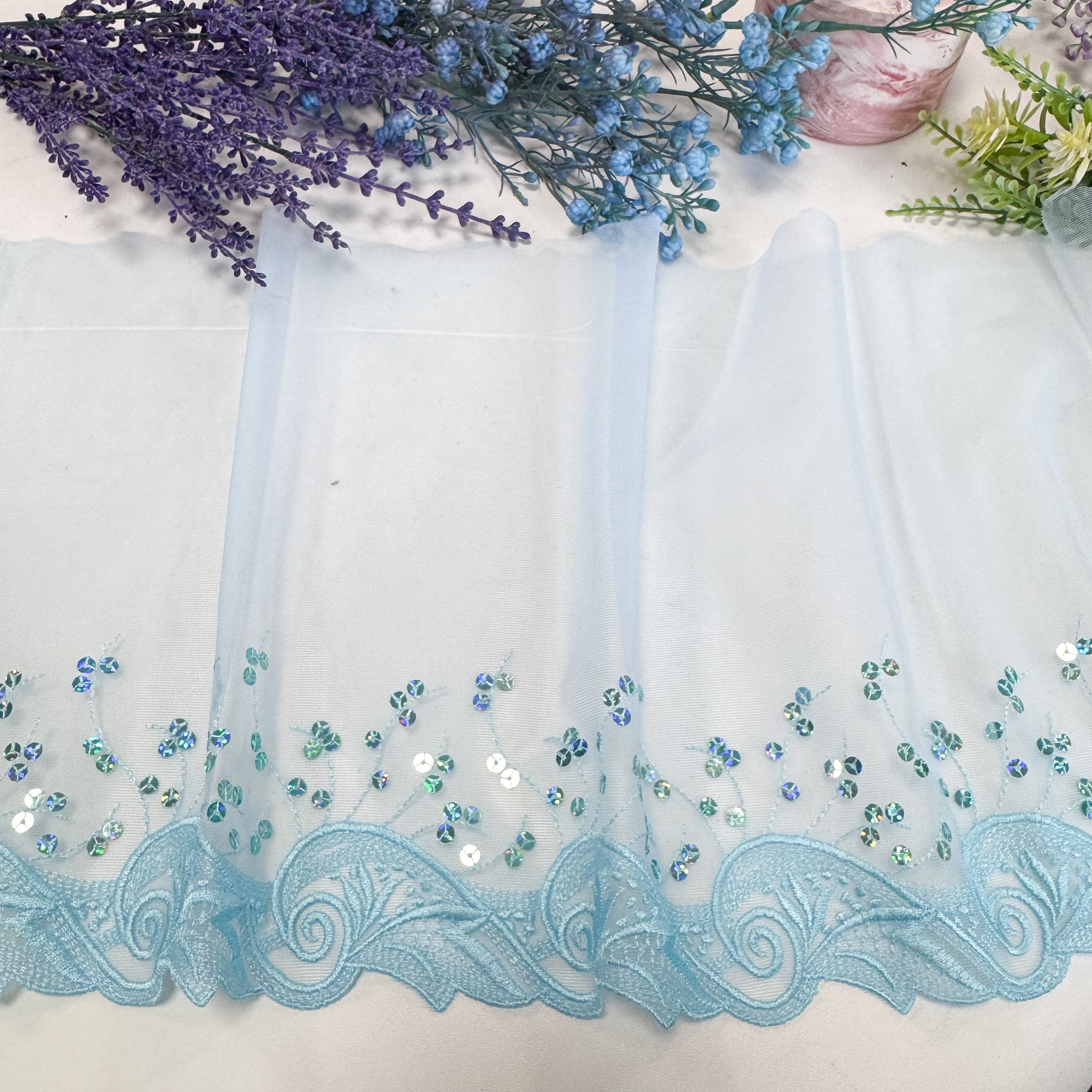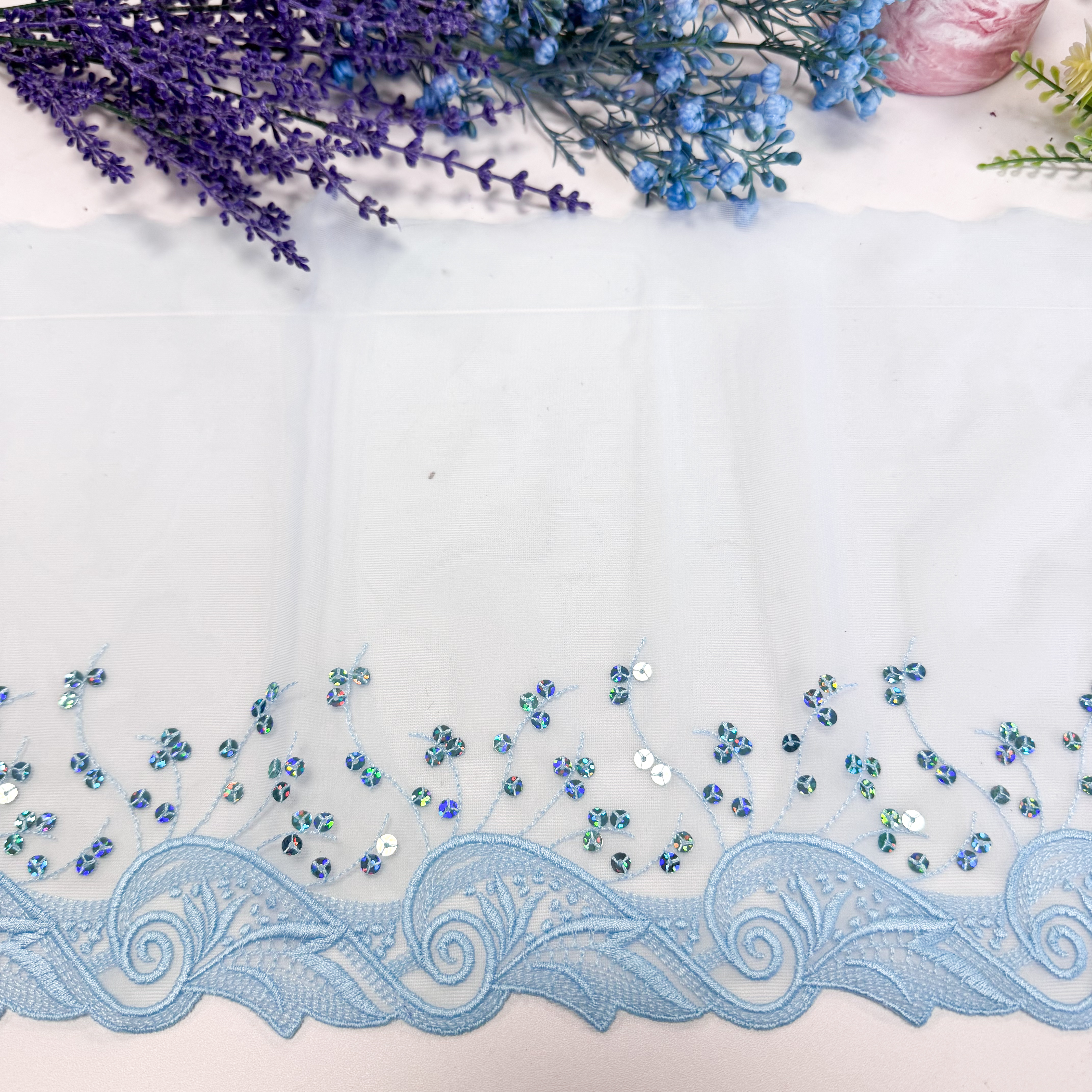Кружево не стрейч вышивка на сетке, голубое, шир. 24 см, арт. 1937К