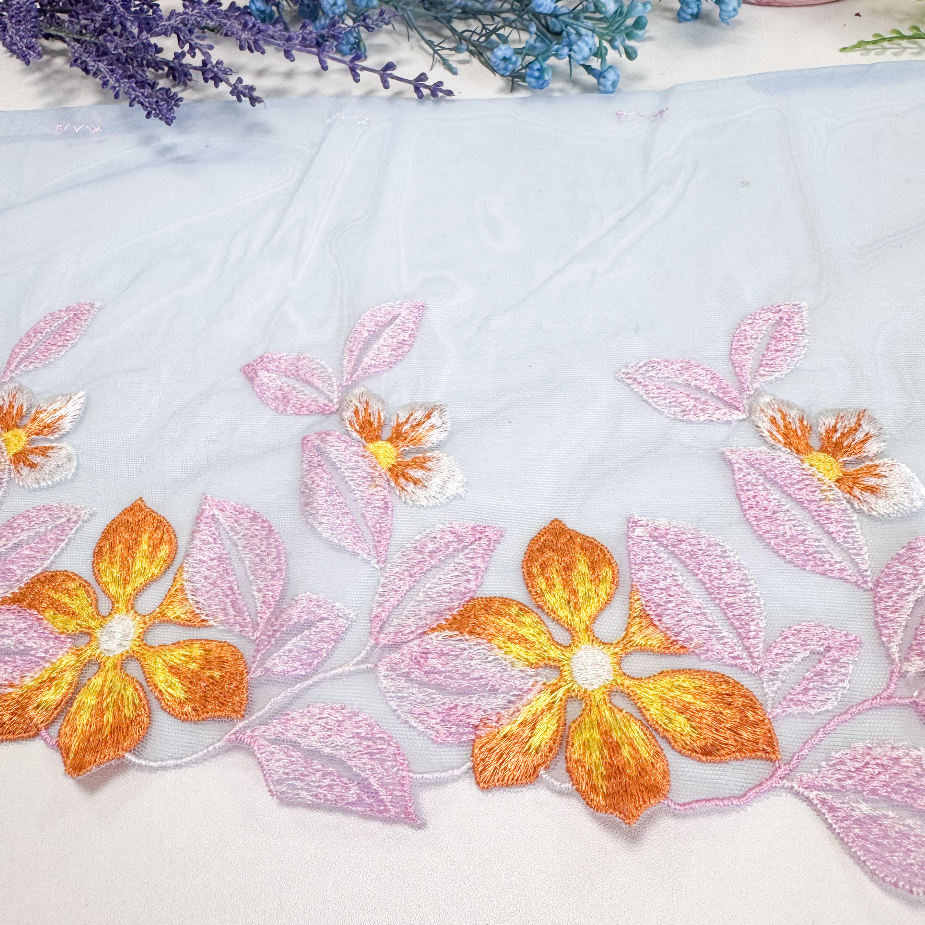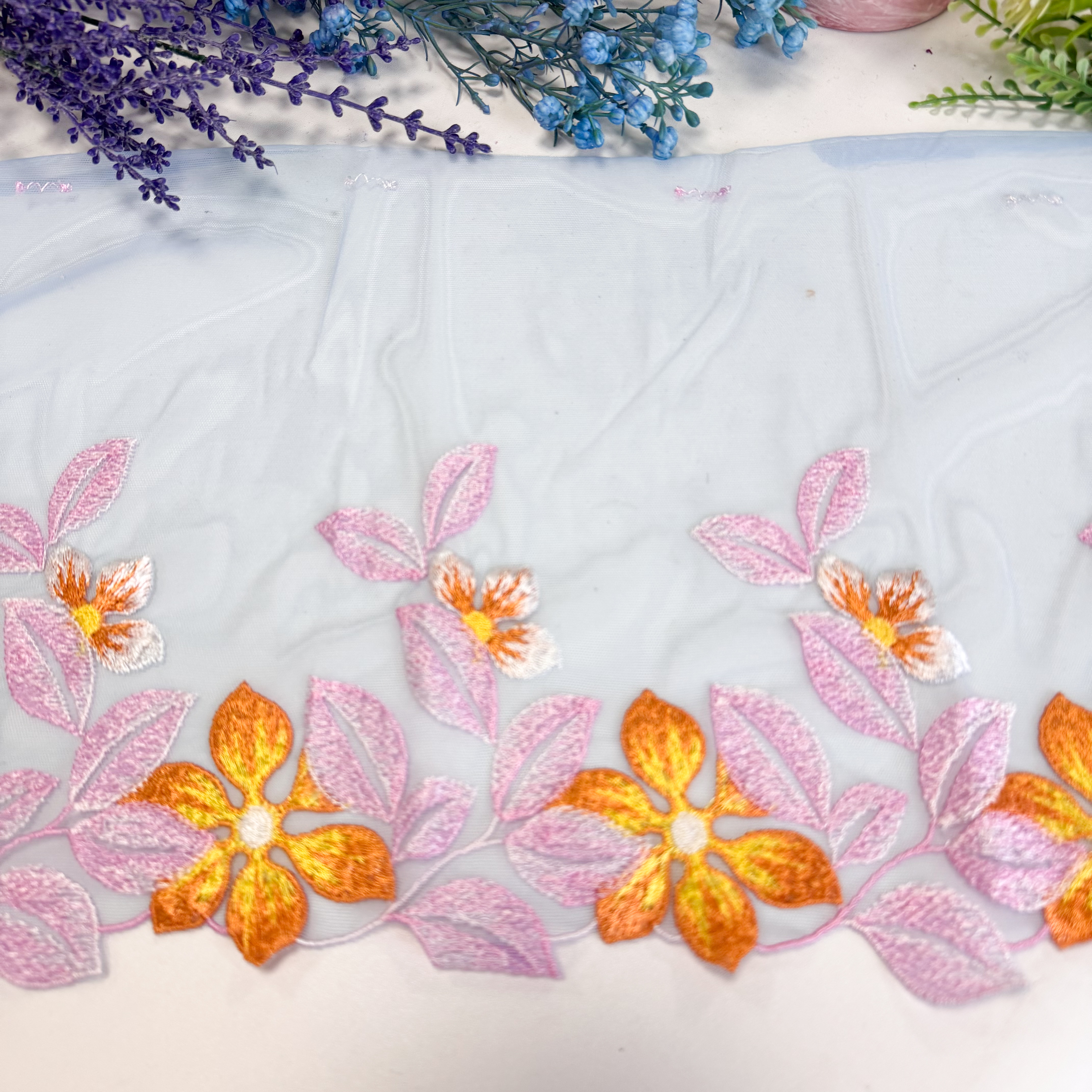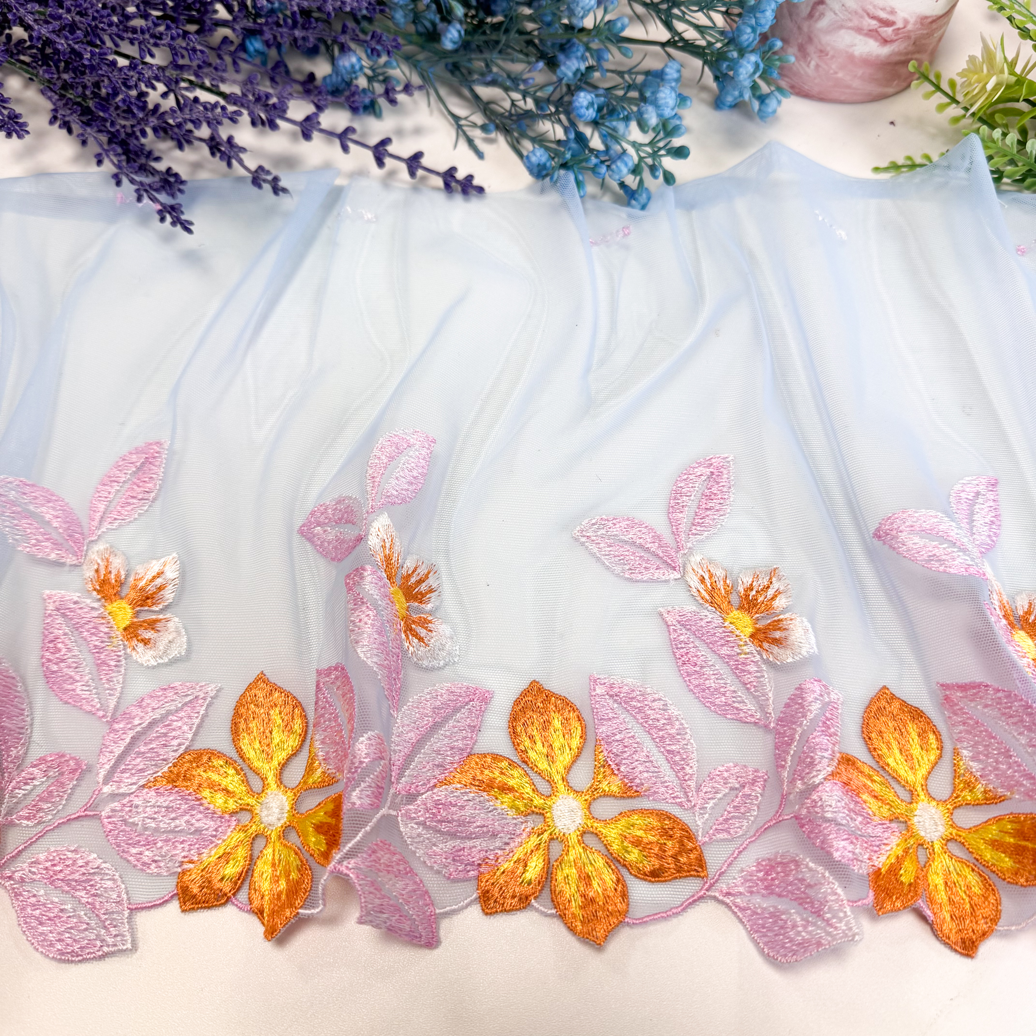 Кружево стрейч вышивка на сетке, голубое, шир. 25 см, арт. 1948К